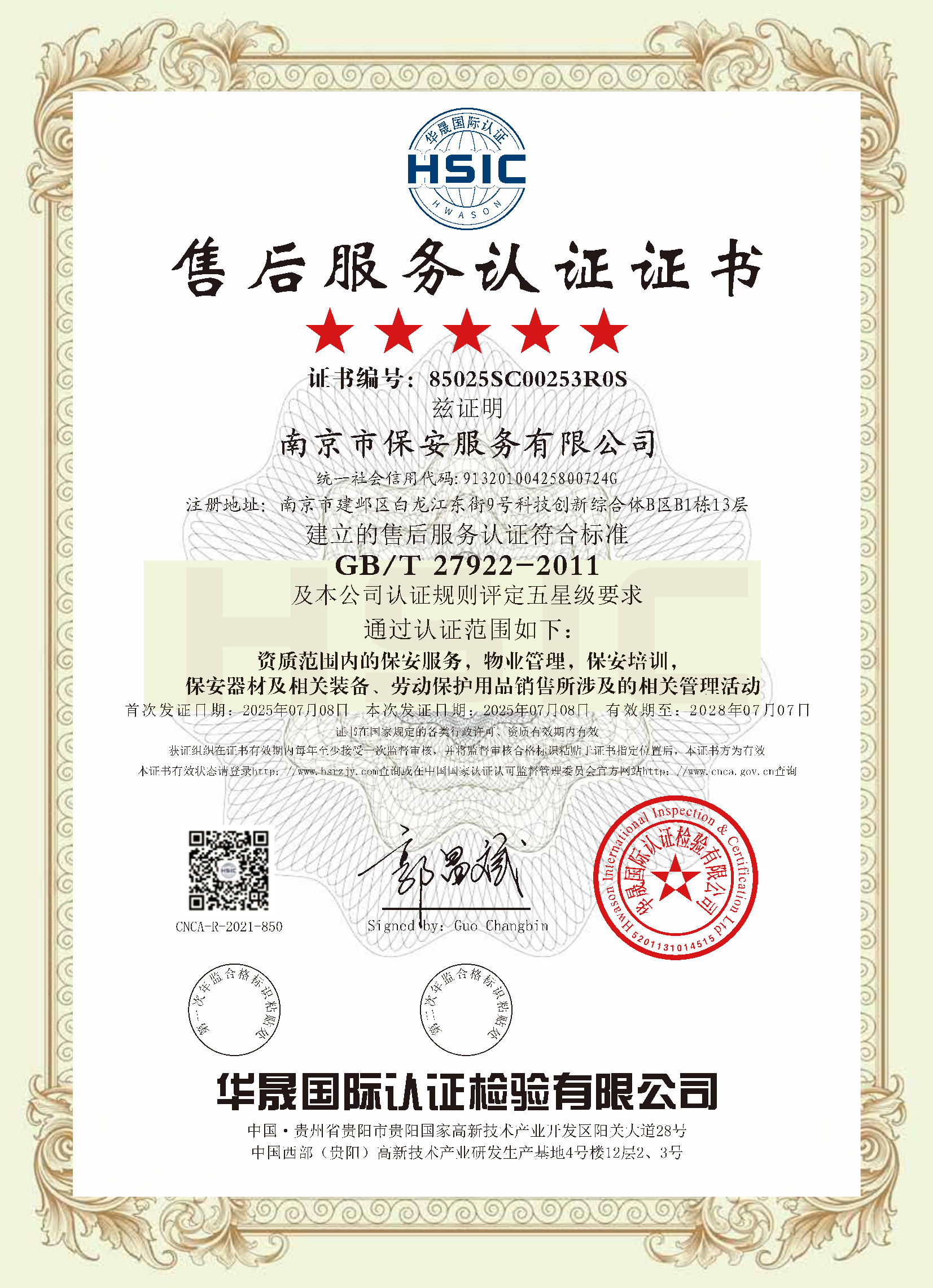 保安服務(wù)一級認(rèn)證證書